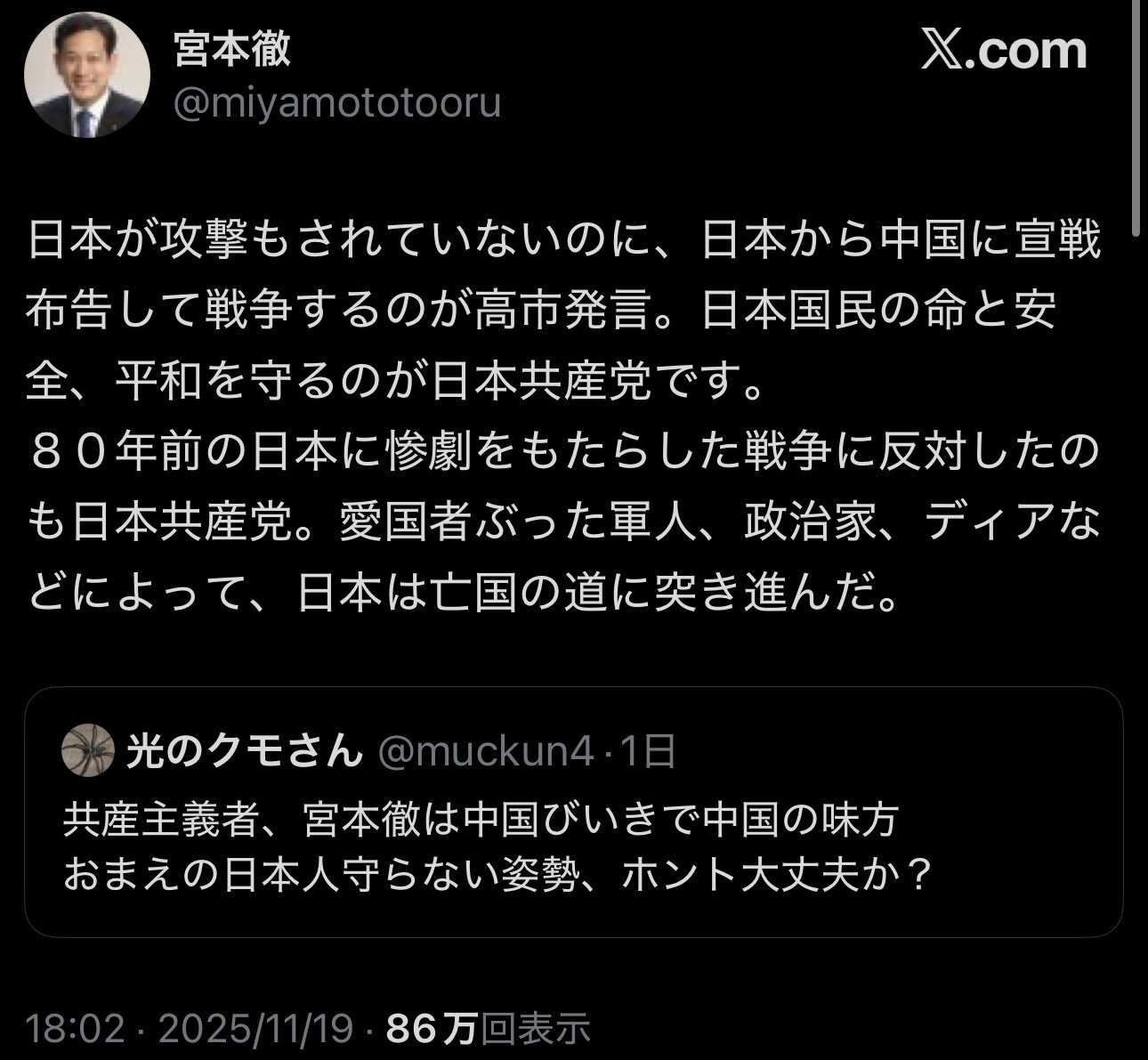 引用元: ・共産党「日本が攻撃もされていないのに、日本から中国に宣戦布告して戦争するのが高市発言。」 [271912485]