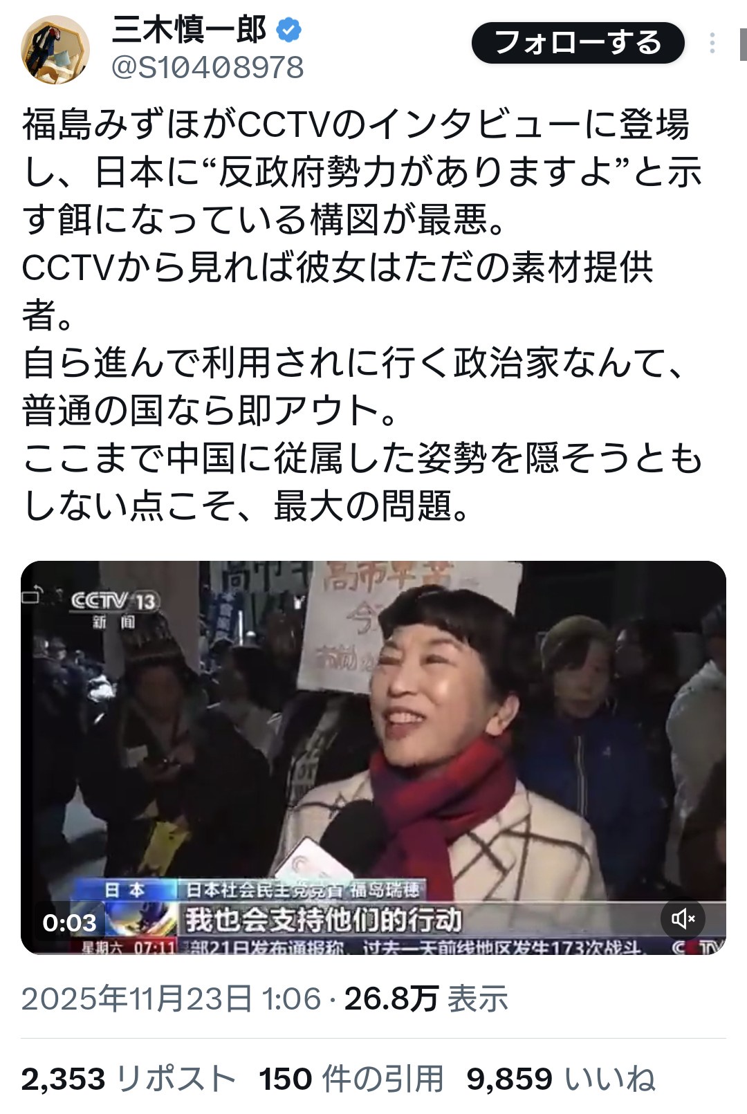 The post 反高市デモを取材しに来た中国CCTVのインタビューに福島みずほ氏が登場する first appeared on Tweeter BreakingNews-ツイッ速!.