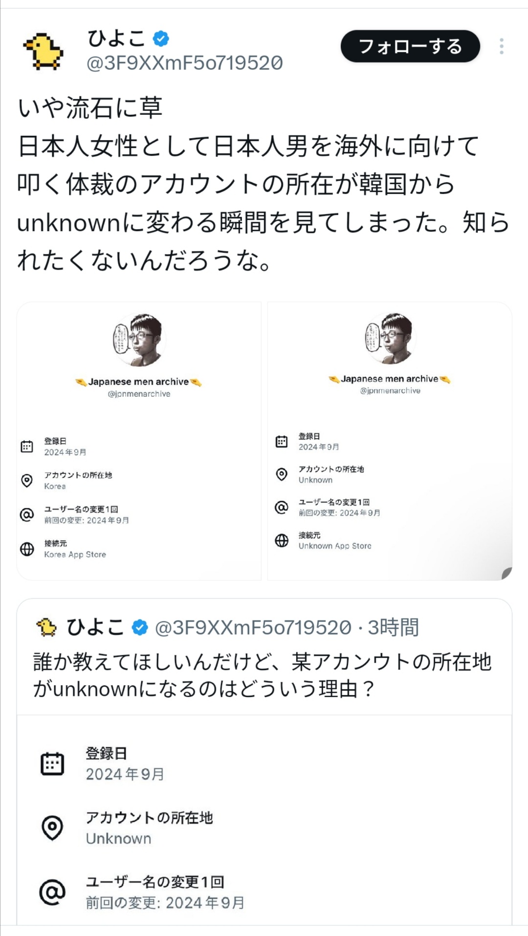 引用元: ・【悲報】Xで日本人男を叩いていたツイフェミアカウント、韓国人だったwwwwwwwwww
