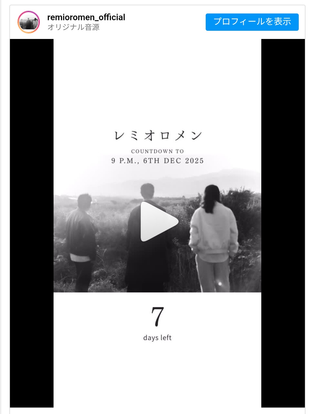 アカウントではこれまで過去楽曲の音源や映像が投稿されており、新たに公開されたのは、3人が後ろ姿で並ぶ写真とともに「7 days left…」「COUNTDOWN TO 9 P.M., 6TH DEC 2025」と記された画像。投稿内容からは、12月6日午後9時に向けて何らかの発表が予定されていることが示唆されている。