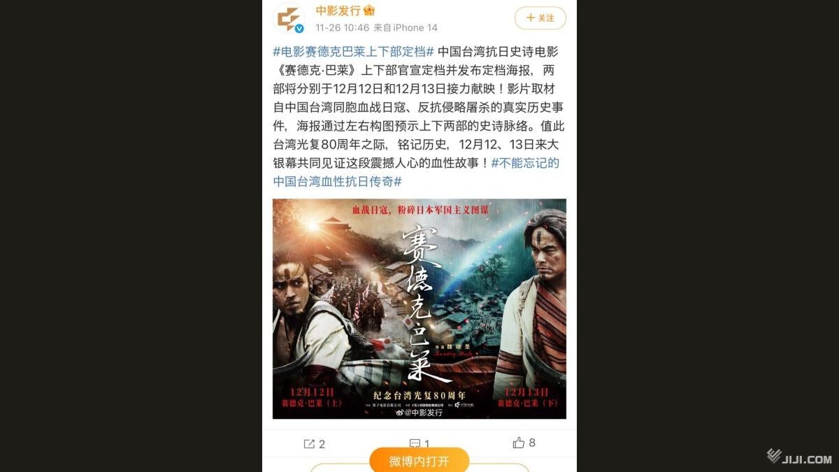 中国で12月、日本統治時代の台湾先住民による抗日闘争を描いた2011年の台湾映画「セデック・バレ」がリバイバル公開される。