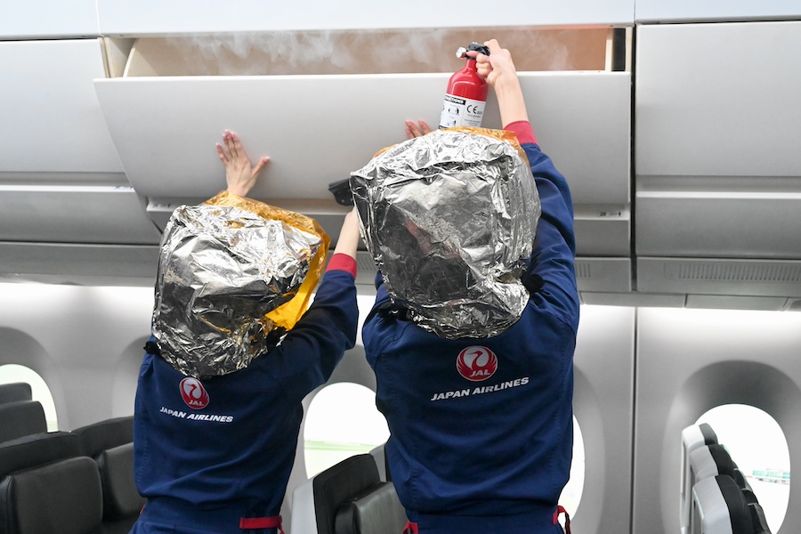 羽田空港にある訓練施設では12月2日、機内でモバイルバッテリーが発熱・発火した場合の対処手順を客室乗務員がデモンストレーションした。(略)