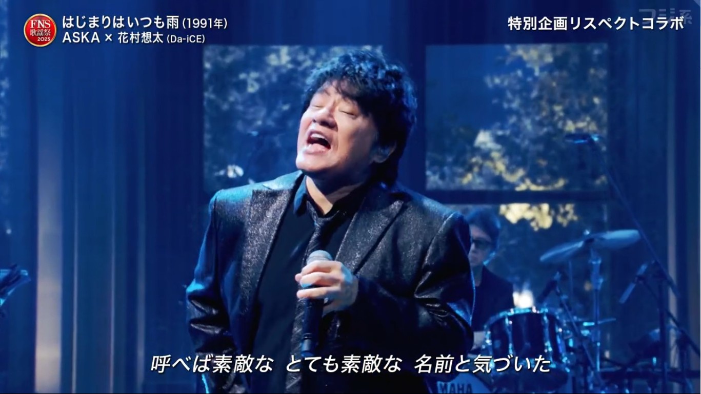 ASKAは1995年リリースの自身4枚目のシングル曲「晴天を誉めるなら夕暮れを待て」をフルで披露したのに続き、「Da-iCE」の花村想太と1991年の楽曲「はじまりはいつも雨」を熱唱。