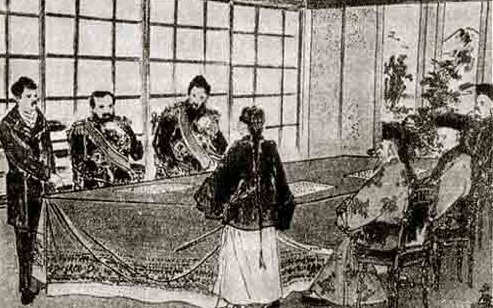 日清戦争で敗北した清の李鴻章が1895年3月、下関条約を結ぶために日本の伊藤博文と談判する様子を描いた挿絵=