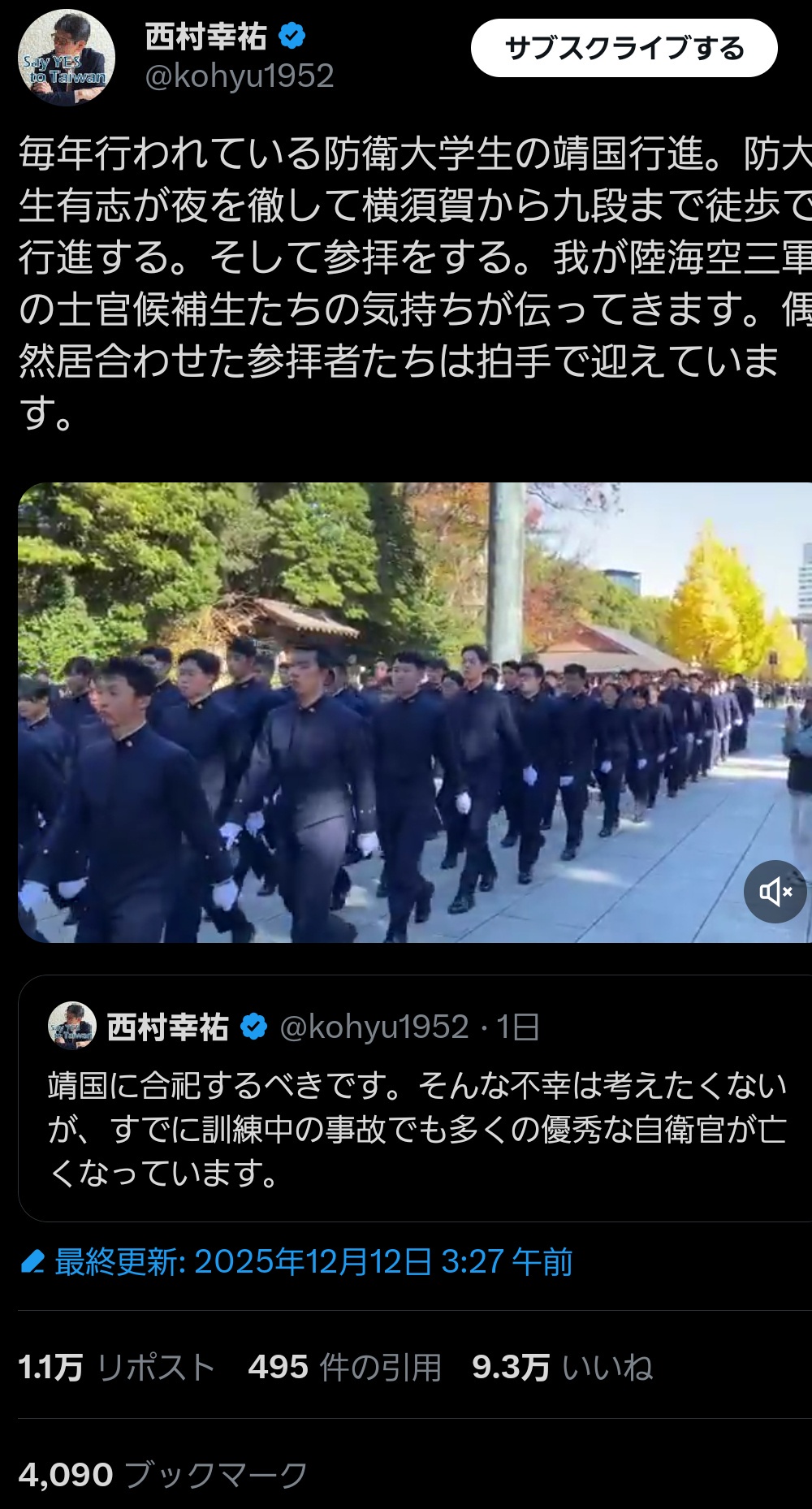 引用元: ・【悲報】防衛大学生、15時間かけて徒歩で横須賀から靖国に向かい参拝してしまう…