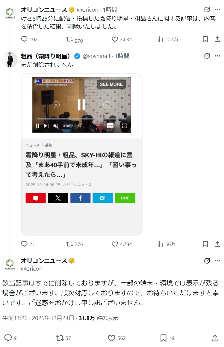 The post オリコン「粗品さんの記事を削除します」粗品「!??(シュババ」 first appeared on Tweeter BreakingNews-ツイッ速!.