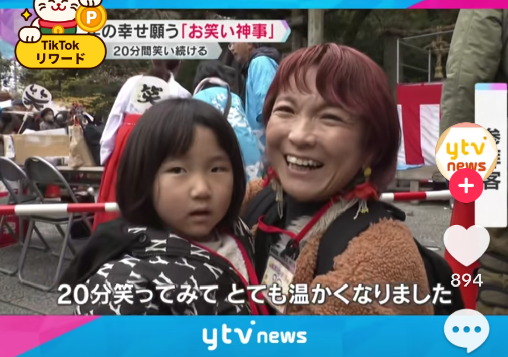 参拝者らは、宮司の合図で「あっはっはー」と3度の高笑いに続き、福を呼び込むとされる「笑福守(しょうふくまもり)」を掲げながら約20分間、笑い声を境内に響かせた。