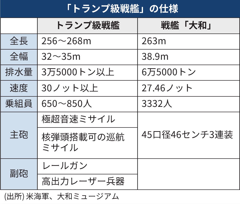 【ワシントン=飛田臨太郎】トランプ米大統領が米海軍の最新鋭戦艦の建造に乗り出した。全長は第2次大戦当時の日本の戦艦「大和」と同等で、磁力を使って弾丸を発射する「レールガン」といった最先端の装備品を搭載する。米専門家は戦艦は建造費が巨額で、現代の戦争には有効でないとして実現性を疑問視する。