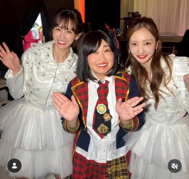 インスタグラムに投稿された写真では、キンタロー。さんはチェック柄の衣装を着用。ステージをバックに、白いミニ丈の煌びやかな衣装の前田さんと板野さんの間に立ち、笑顔の3ショットを披露していた。