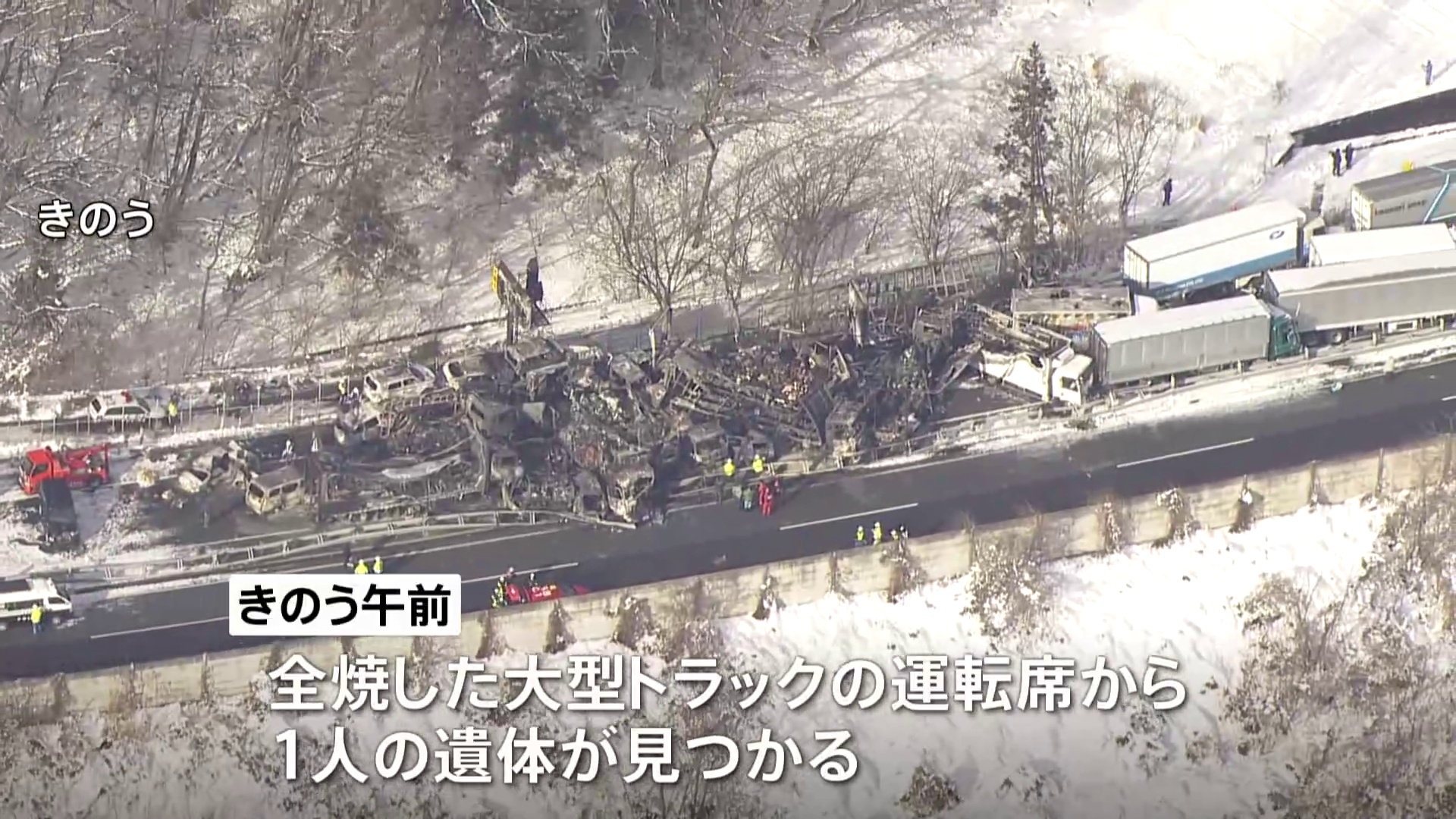 関越道で67台多重事故 新たに1人の遺体が見つかり計2人死亡・26人重軽傷 下り線の一部区間で通行止め続く 午前0時45分現在