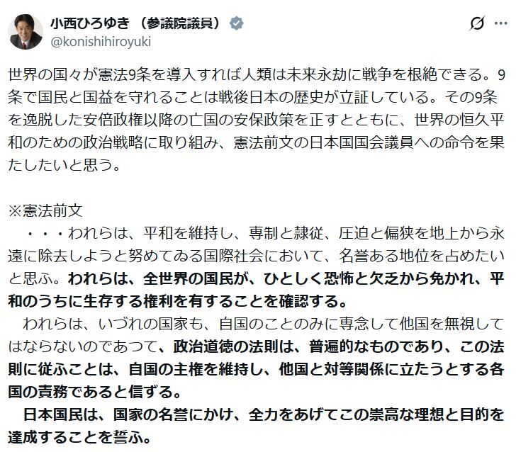 再)立憲議員「世界の国々が憲法9条を導入すれば人類は未来永劫に戦争を根絶できる」投稿に様々な声