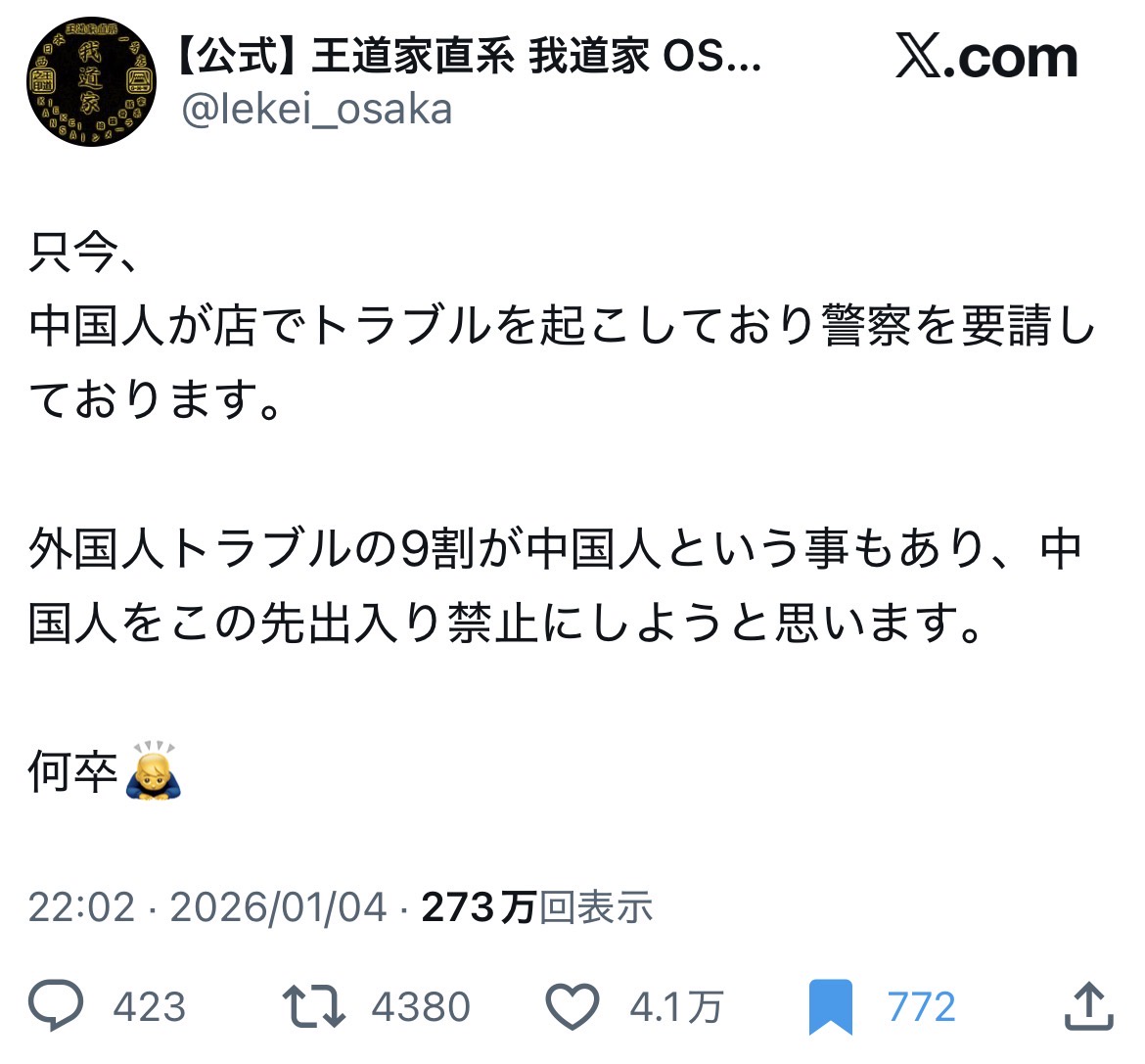家系ラーメン我道家「中国人を出入り禁止にする」 とヘイト投稿。