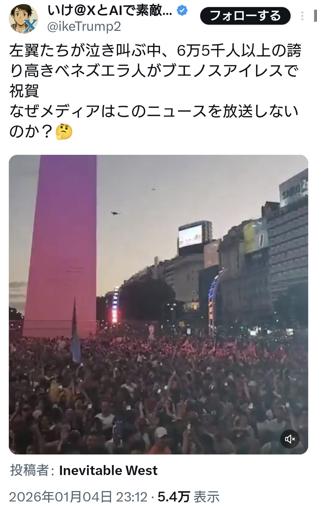 The post ブエノスアイレスにてベネズエラ人がマドゥロの逮捕祝賀会。オールドメディアは報道せんの? first appeared on Tweeter BreakingNews-ツイッ速!.