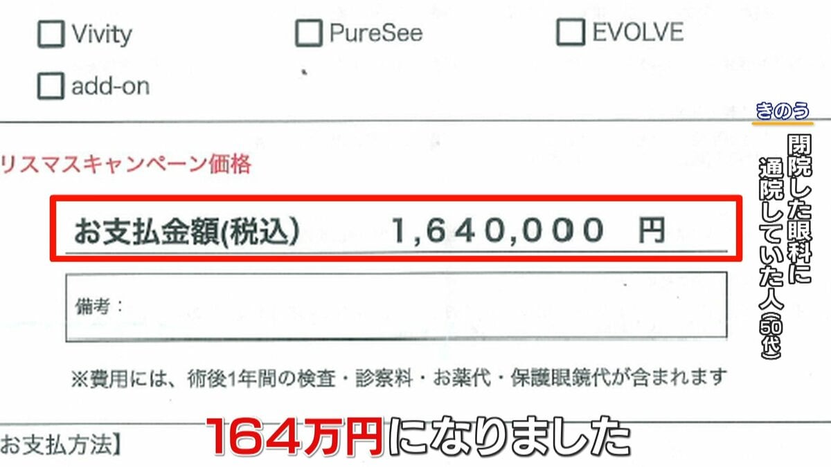 お値段がめちゃくちゃ高いと思ったんですけど、164万円になりました。「事前に高額な料金を支払ったにも関わらず通院ができなくなった」と『サン!シャイン』のカメラに答えてくれたのは、通っていた眼科が突然閉院してしまった女性です。