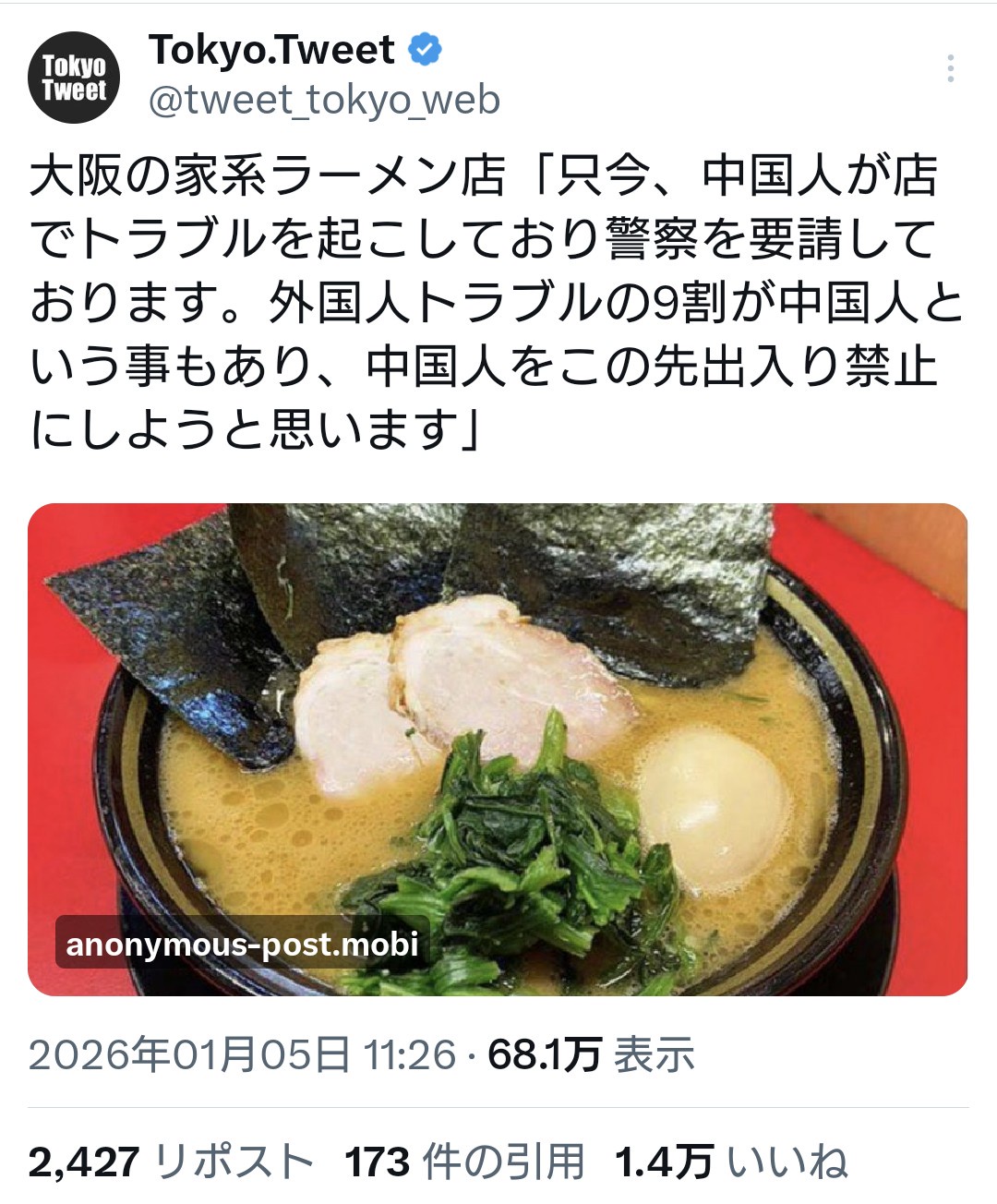 The post 大阪の家系ラーメン店「迷惑で〇い中国人をこの先出入り禁止にしようと思います」 first appeared on Tweeter BreakingNews-ツイッ速!.