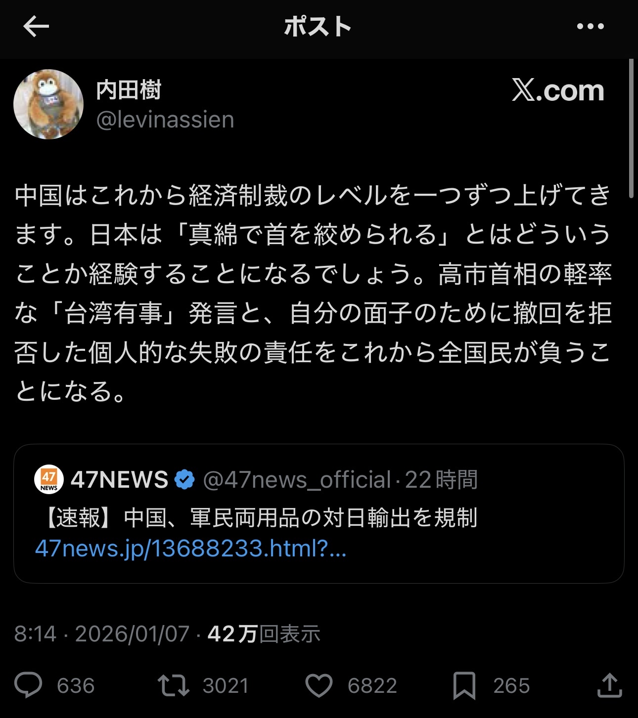 The post X識者「中国は経済制裁レベルを一つずつ上げていき日本は『真綿で絞められる』を経験することになる」 first appeared on Tweeter BreakingNews-ツイッ速!.