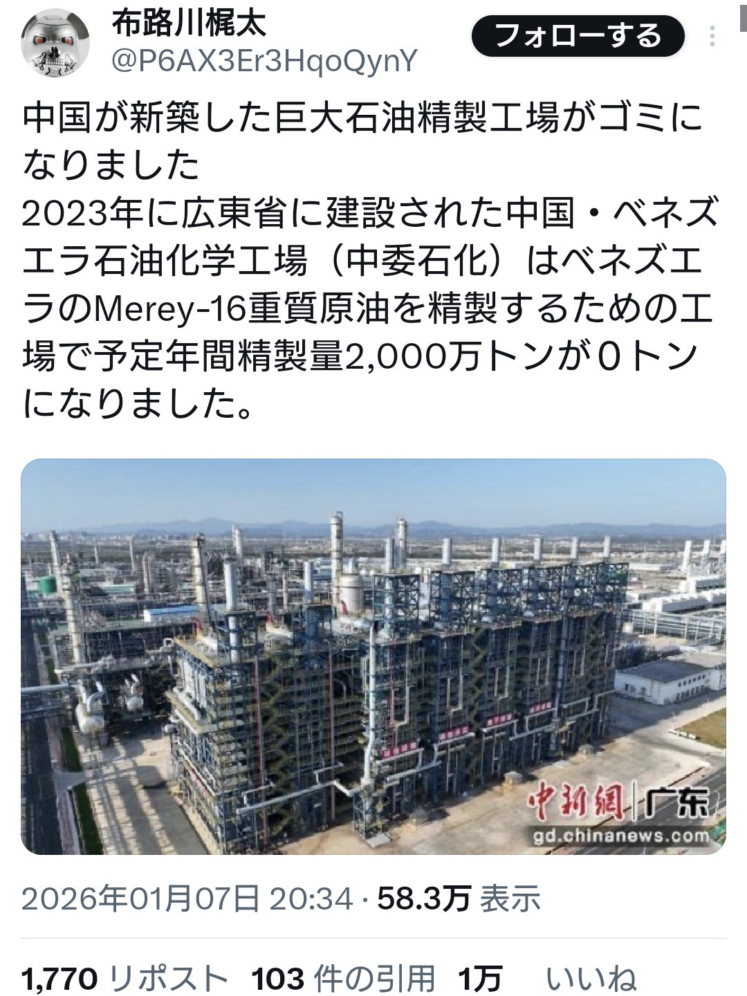 The post 中国が新設したベネズエラ巨大石油精製工場。無事ゴミ化へ first appeared on Tweeter BreakingNews-ツイッ速!.