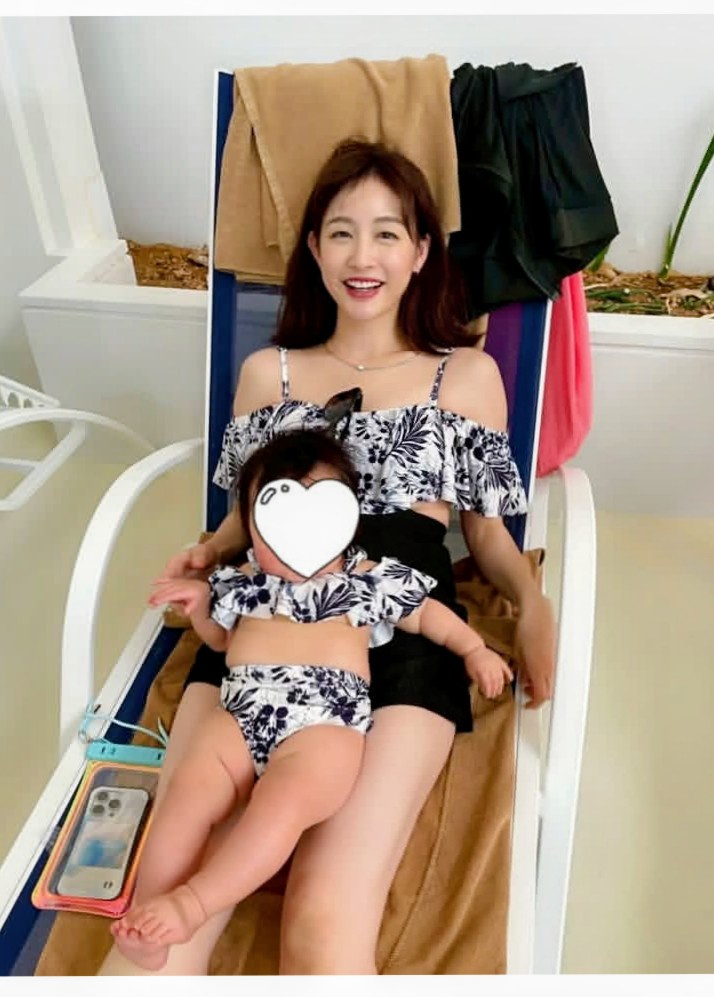 今回、家族で沖縄旅行に訪れたことを報告し、《ビキニなんてもう着ることないと思ってたけど、お揃いになるなら…と着ちゃいました!》とつづり、水着姿の写真を公開した。