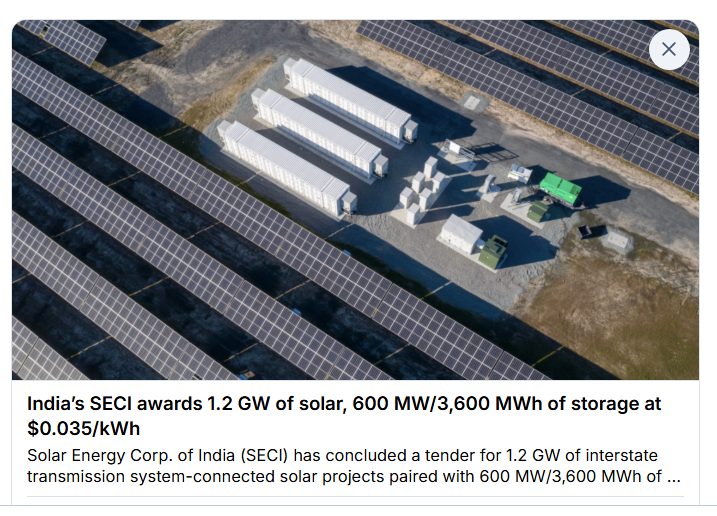 インドで発表された太陽光発電と蓄電池を組み合わせた新しい電力価格だ。発電コストは1kWhあたり3.5セントで、これは化石燃料による発電を事実上、競争不能にする水準だと強調されている。