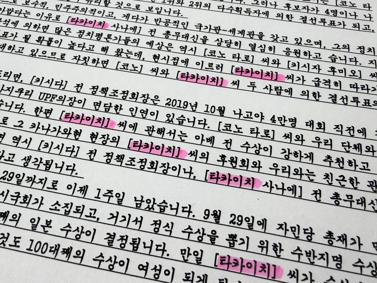 (写真)高市早苗首相の名前(着色部分)が繰り返し出てくる統一協会の「TM特別報告」(着色は編集部)