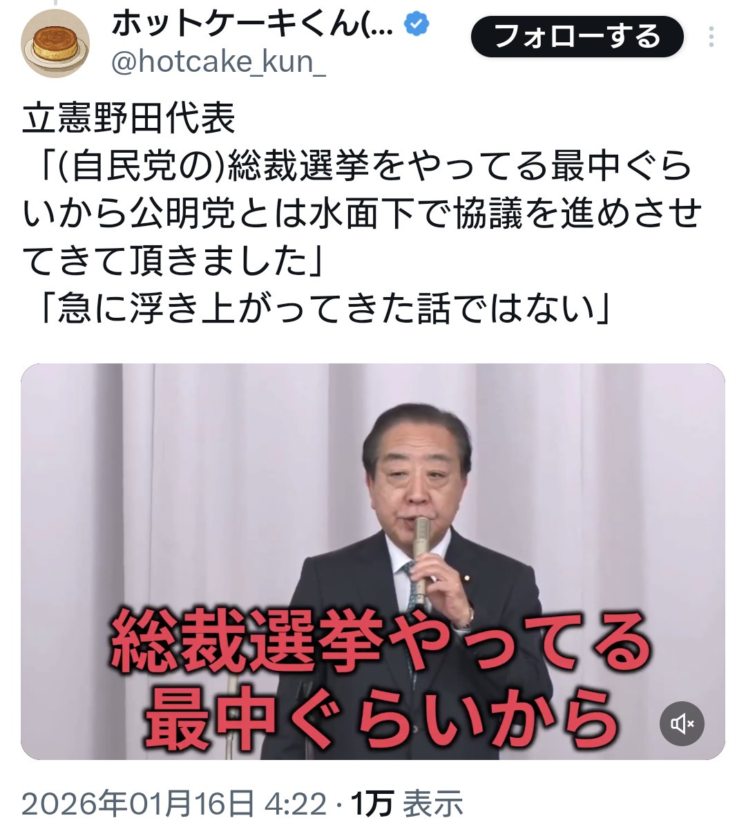 The post 立憲・野田代表「実は自民党総裁選の時から新党の協議をしてました」 first appeared on Tweeter BreakingNews-ツイッ速!.