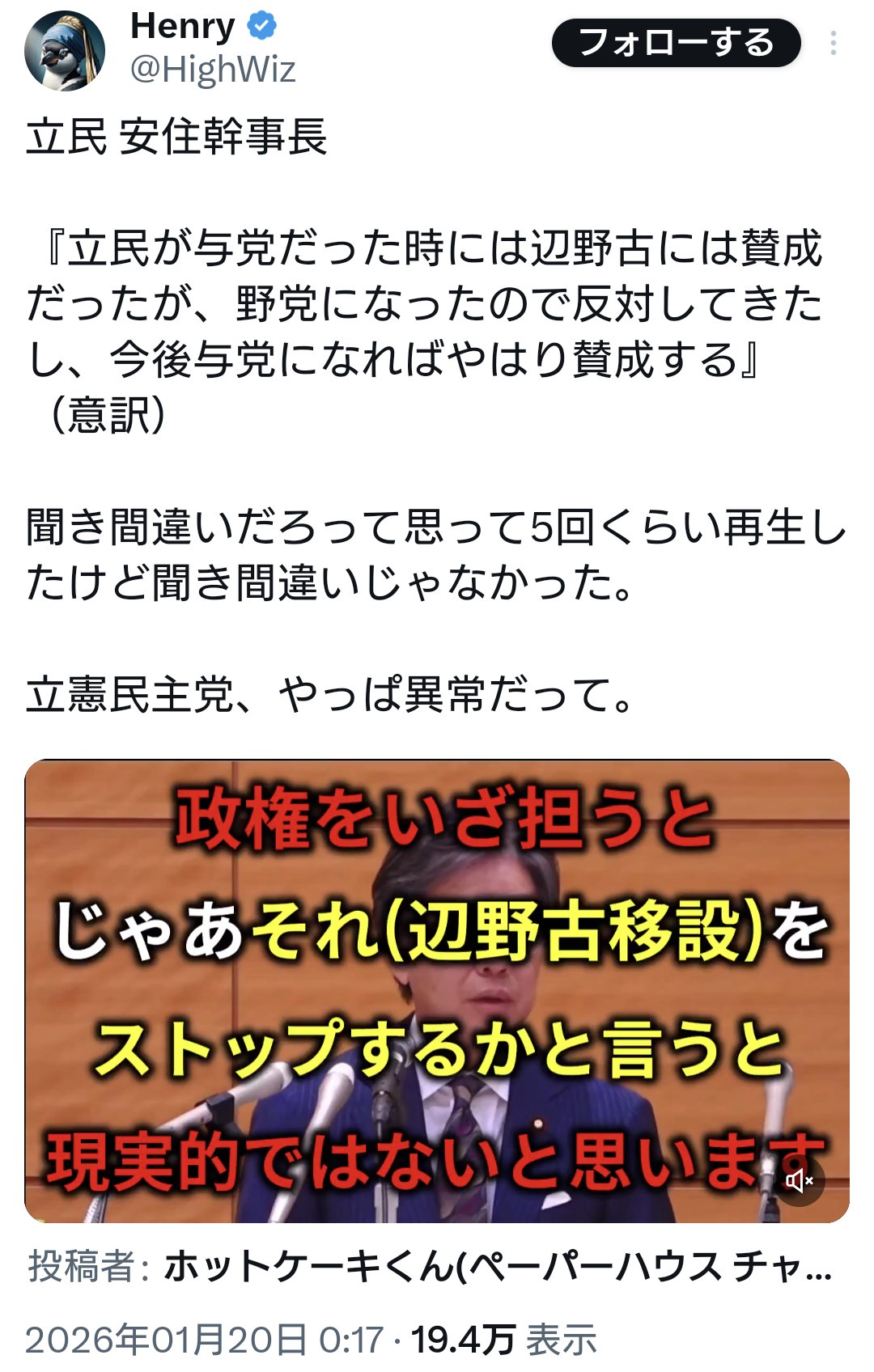 立憲・ 安住氏「立憲が野党になったので辺野古に反対してきたが、今後与党になれば賛成する」