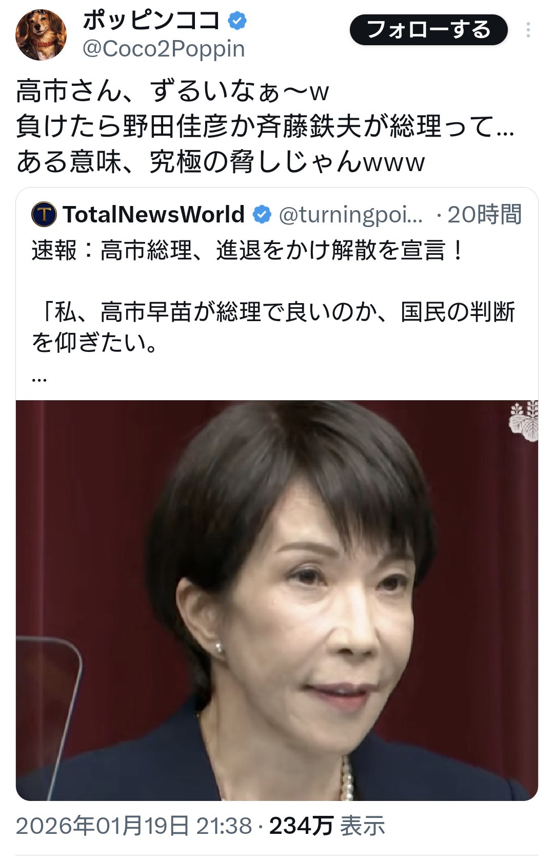 引用元: ・高市総理、日本国民を脅す「負けたら野田総理、または斎藤総理になります」 [662593167]