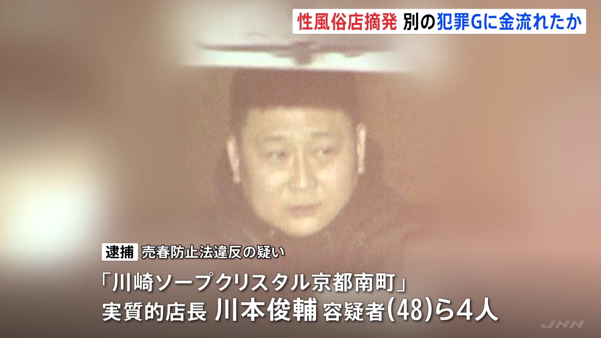 売春防止法違反の疑いで逮捕されたのは、川崎市の性風俗店「川崎ソープクリスタル京都南町」の実質的店長・川本俊輔容疑者(48)ら4人です。