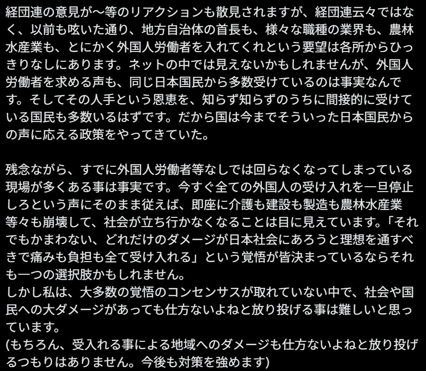 引用元: ・【悲報】小野田大臣「ネット軍師様にはわからないかもだけど、外国人労働者いないとあかんわ」