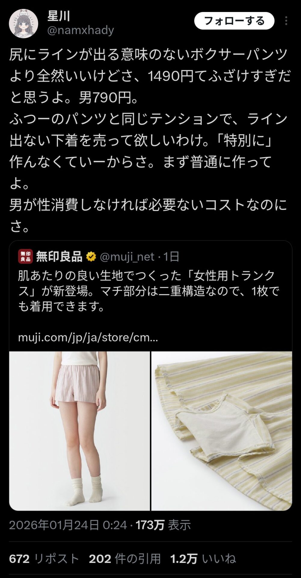 The post 無印の女性用トランクスに女性様がブチギレ 性消費がどうのこうの first appeared on Tweeter BreakingNews-ツイッ速!.