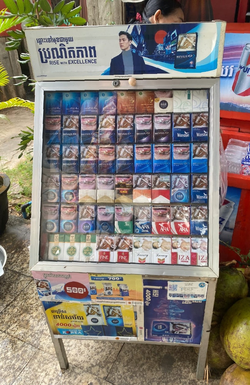 カンボジアではたばこパッケージの55%に写真健康警告を施すことが義務付けられ、広告や販売促進が禁止されている。ただ、写真健康警告がないたばこが置かれ、広告が掲示されている店もあるという=2025年10月31日、シエムレアプ(モム・コン医師提供)