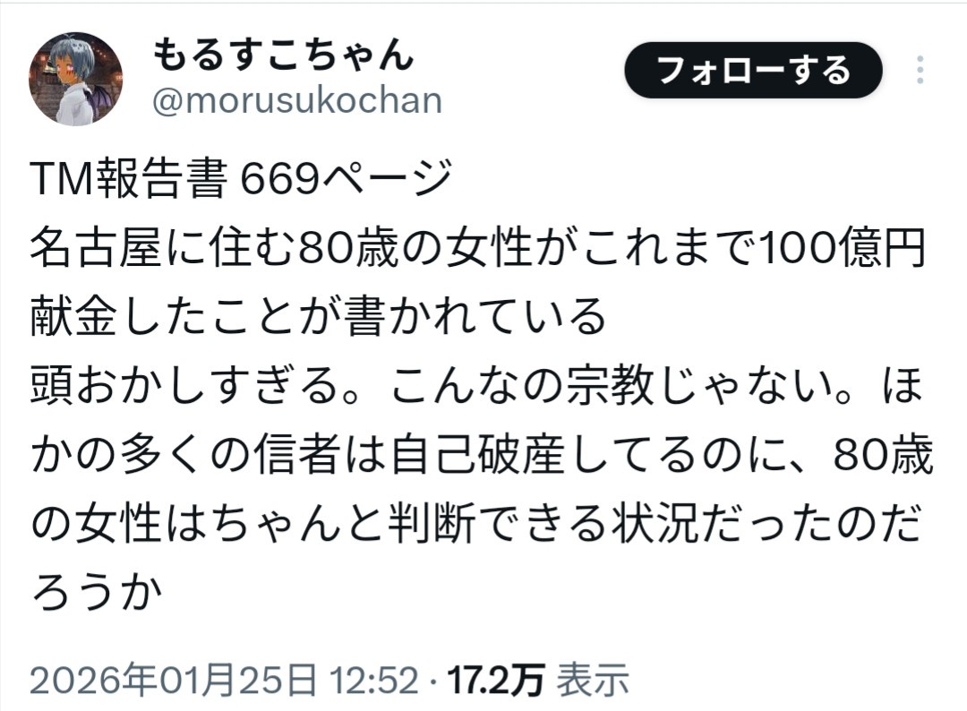 引用元: ・【高市悲報】TM文書、名古屋の80歳女性が統一教会に寄付100億円 [487816701]