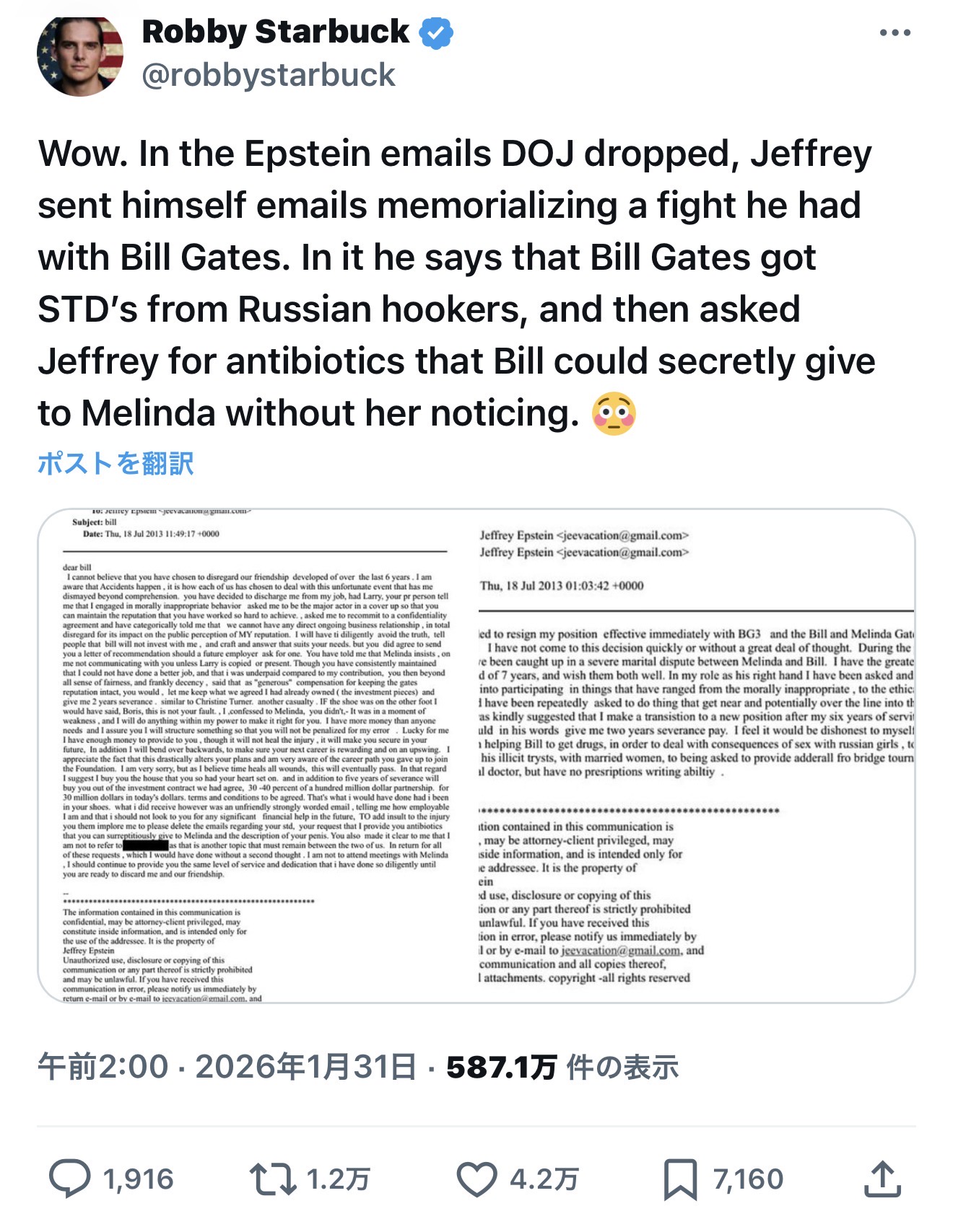 すごい。司法省が公開したエプスタイン関連のメールには、ジェフリーがビル・ゲイツとの口論を思い出すようなメールを自分に送っていたことが書いてあった。その中で彼は、ビル・ゲイツがロシア人売春婦から性感染症に感染し、メリンダに知られずにこっそりと抗生物質を投与できるよう、ジェフリーに抗生物質を頼んだと書いている。 😳