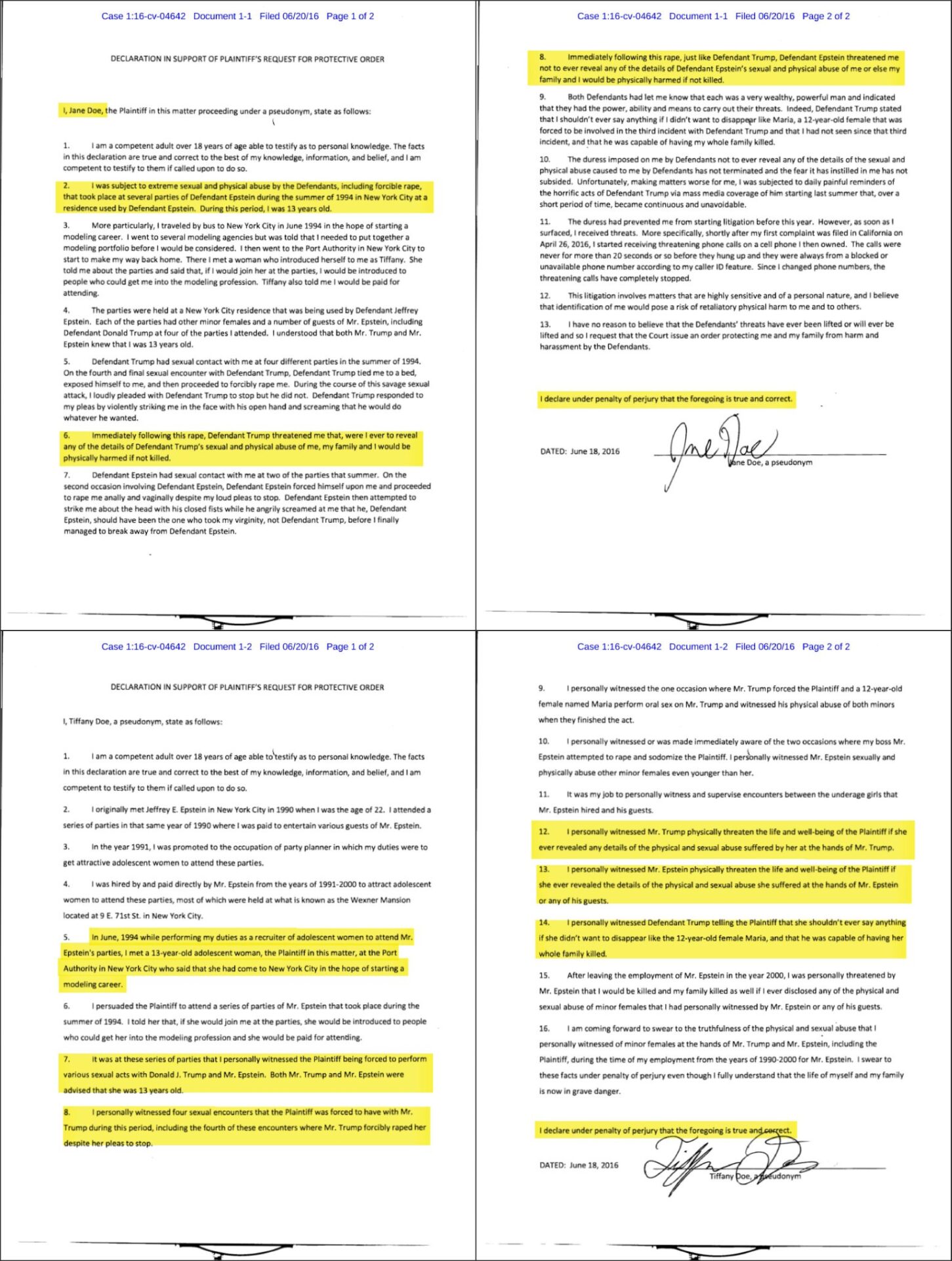 宣誓供述書の中で、彼女は4回目のパーティーでトランプ大統領から受けたとされる暴行について述べ、「この強姦の直後、被告トランプは、私が被告トランプによる性的および身体的虐待の詳細を ever 明らかにした場合、私と私の家族は殺されないまでも身体的危害を加えられると脅迫した」と記している。