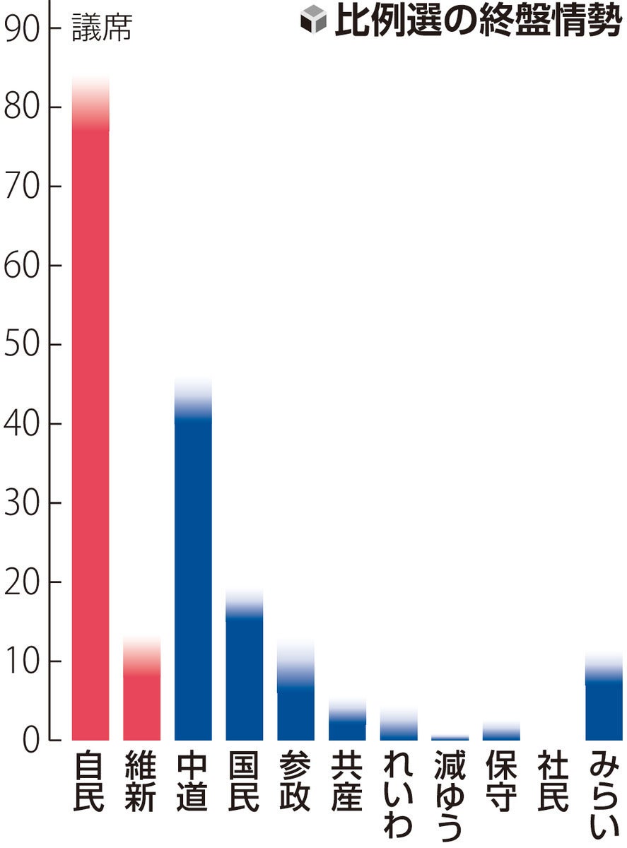 中道改革は、公明から参加した前議員ら28人を全11ブロックの上位で名簿に登載した。重複立候補している立民出身者は小選挙区で落選した場合、比例復活当選に向けて少ないパイを争う形となる。中道改革内では「大負けしたら誰かが責任を取らないといけない」(若手)との声が出ている。