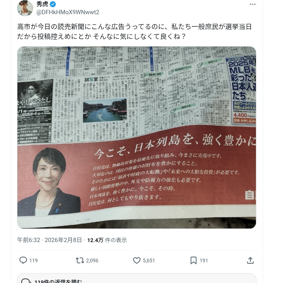 引用元: ・【朗報】高市、投票日当日に新聞に広告を出してしまう…「選挙活動じゃなく党の広報」だからOK! [732289945]