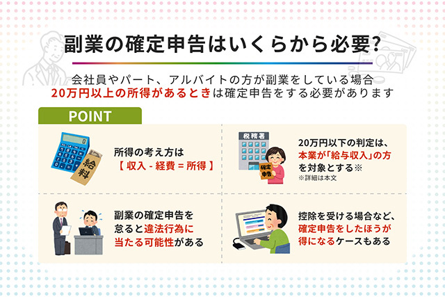 会社員やパート、アルバイトの方が副業をしている場合、20万円以上の所得があるときは確定申告をしなければいけません。所得とは収入から経費を差し引いた金額のことをいいます。売り上げを基準に判断するわけではないので注意しましょう。