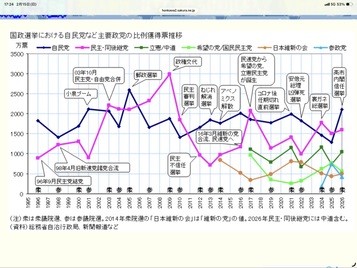 【衆院選】三橋貴明「自民の『比例』の議席数67は少なくて驚いた。得票率38%は低い。高市自民が大勝したのは支持が上がっている訳ではなく『小選挙区制』だから。多党化で労組票が食い合い、自民が漁夫の利を得た」