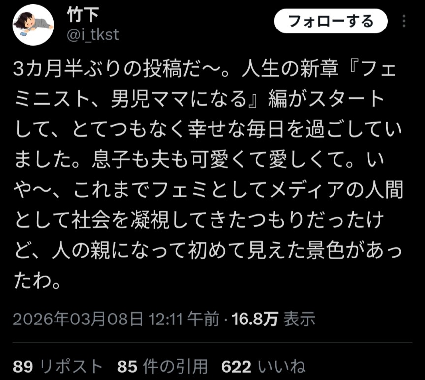 引用元: ・【祝】大物フェミニストの竹下郁子さん、男児を出産