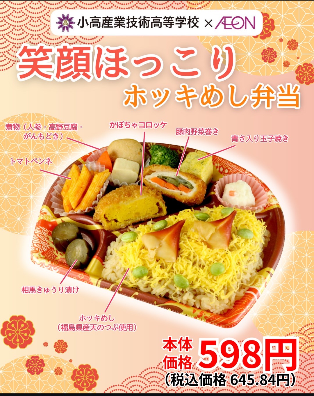 イオンは福島県南相馬市の小高産業技術高と県産食材を生かした「笑顔ほっこりホッキめし弁当」を共同開発した。東北地方を中心にしたイオンやミニストップなどで販売している。