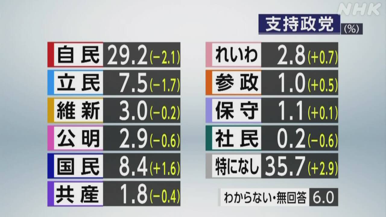 【NHK世論調査】政党支持率 自民党29.2% 国民民主党8.4% 立憲民主党7.5%「支持政党なし」が最多の35.7%