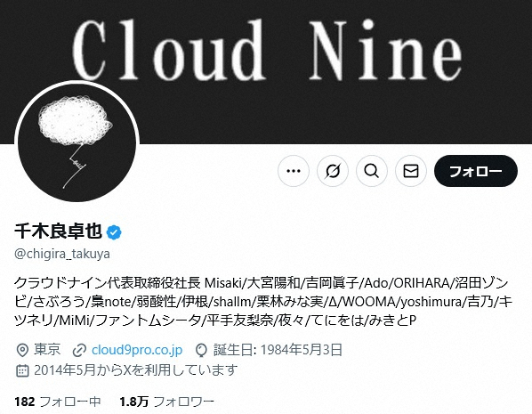 歌い手・Ado(22)、女優・平手友梨奈(23)らが所属する芸能事務所「クラウドナイン」の代表取締役社長・千木良卓也氏が19日までに自身のX(旧ツイッター)を更新。16日(現地時間17日)米ロサン