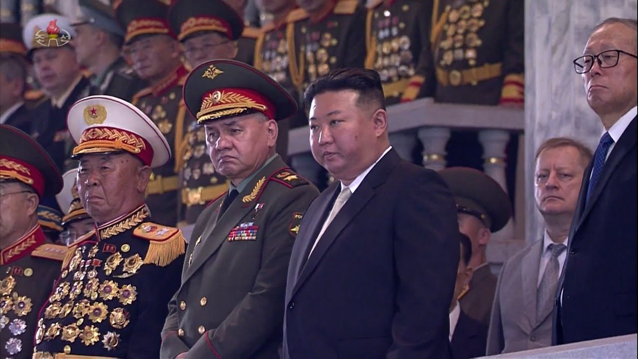 子供たちが歌などを披露するステージでは、後ろのスクリーンに撃ち落とされる戦闘機や無数の弾道ミサイルの映像が流れています。