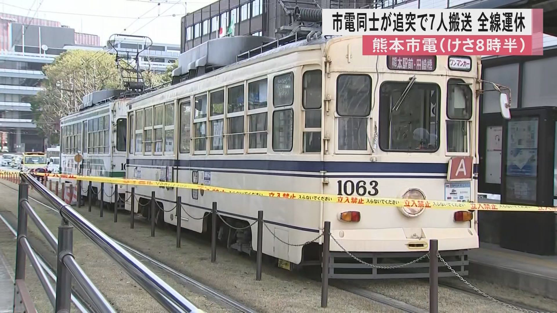 3月25日朝に熊本市中央区の熊本市役所前にある電停で、市電同士の追突事故があり乗客と運転士の計7人が病院に搬送された。