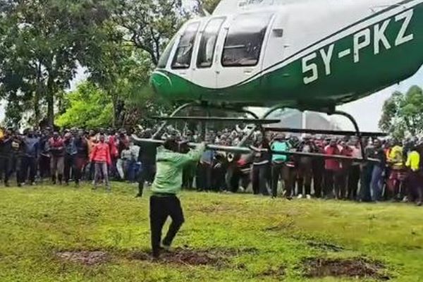 アフリカのケニアで、男性がヘリコプターにしがみつく、衝撃的な瞬間が撮影された。