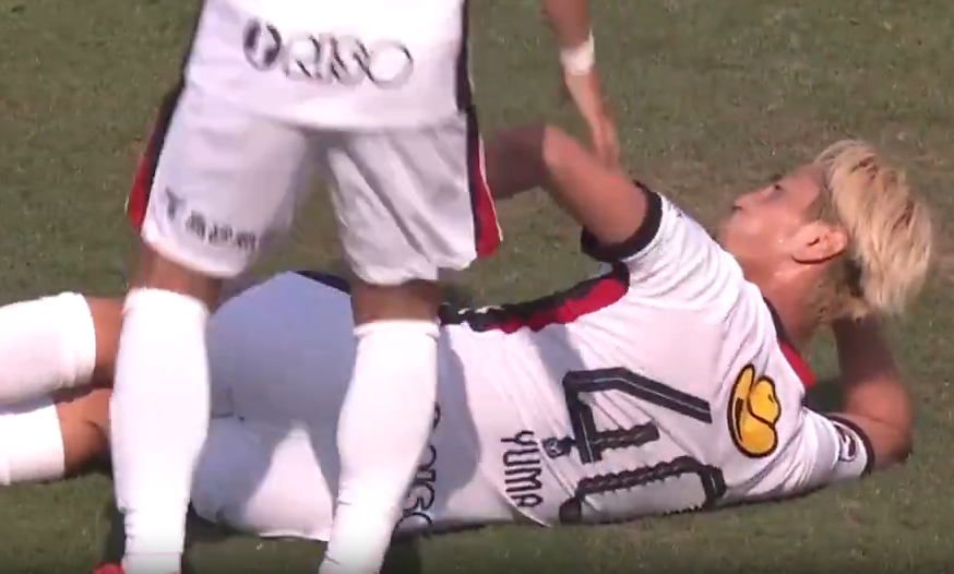 鈴木をまたごうとした相手DFに左腕を踏まれるアクシデントもあったが、お互いにイエローカードは出なかった (略)