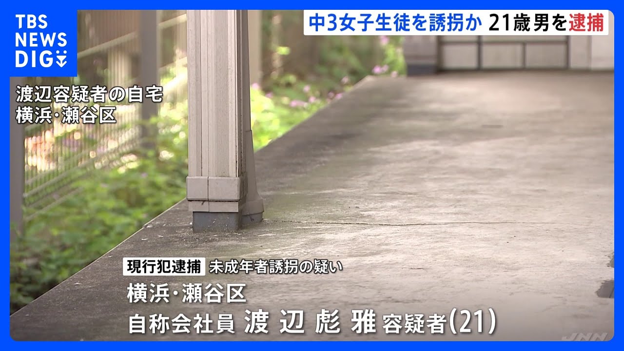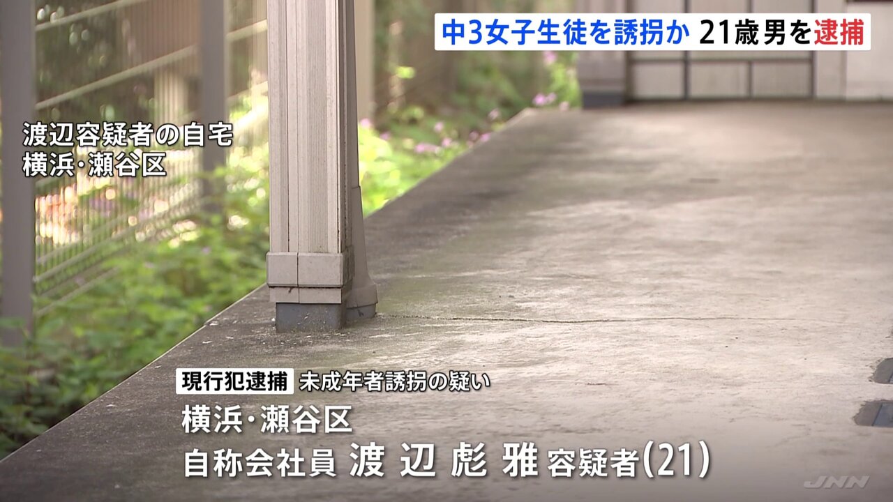 未成年者誘拐の疑いで現行犯逮捕されたのは、横浜市瀬谷区の自称会社員・渡辺彪雅容疑者(21)です。