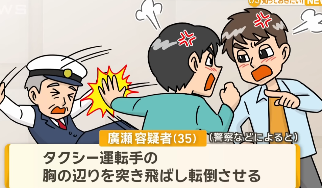 タクシーを降りてからも言い争いが続いたため、運転手が止めに入ったところ、廣瀬容疑者は胸の辺りを突き飛ばして転倒させたと (略)