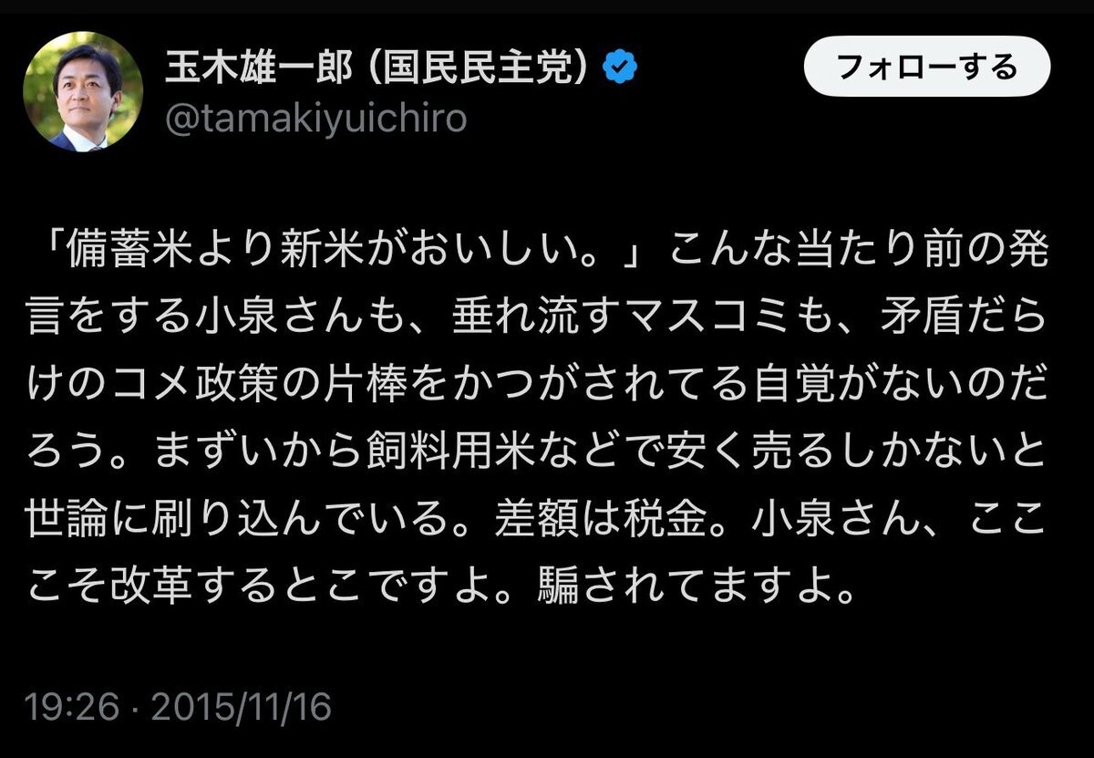 10年後の玉木 「備蓄米は1年たったら動物のえさ」