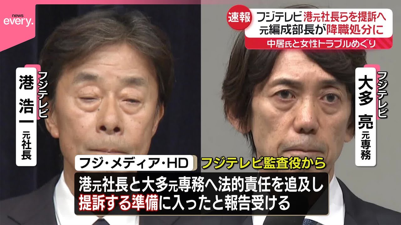 2025-06-05 17:25フジテレビは5日、元タレントの中居正広氏の性暴力に端を発する一連の問題で、港浩一前社長、大多亮専務取締役に対して法的責任を追及するとして訴訟の準備に入ったとした。